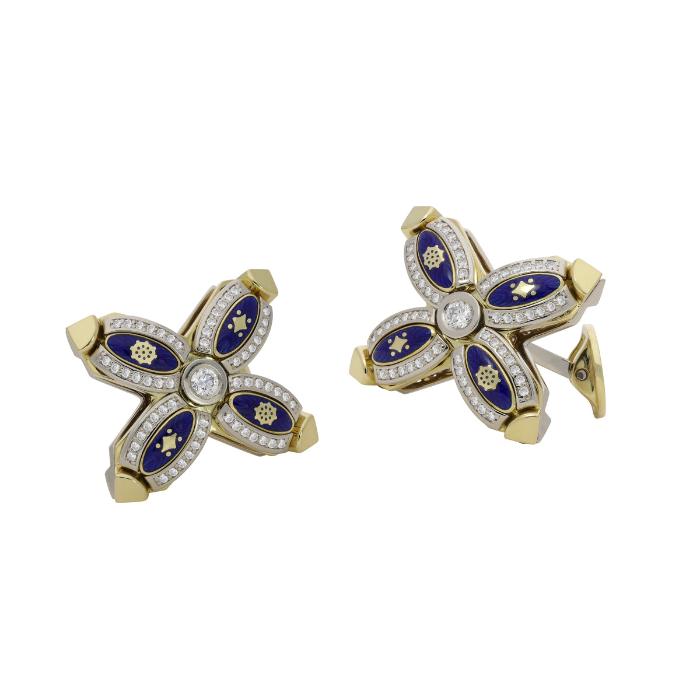 Auksinės sąsagos su Limožo emaliu ir rinktiniais briliantais. Laikui nepavaldi prabanga ir subtili konstrukcija leis dirbiniu džiaugtis ne vienai šeimos kartai.