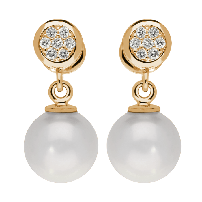 Auksiniai auskarai moterims su Akoja perlais ir briliantas. Pagaminti iš 585 prabos balto aukso, rodžiuoti. Šių auskarų perlai yra kilę iš Japonijos, pagaminti pagal jų ilgaamžes tradicijas. Ypatinga Akoja perlų gamybos technologija leidžia pasiekti ypač gerą blizgesį ir viliojančias spalvas.
