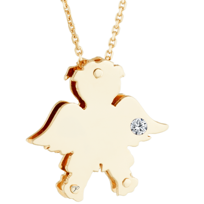 Rankų darbo auksinis pakabukas su briliantu, skirtas vaikams, jaunimui, ypač mėgstamas mamų. Idealiai nugludintas ir švelnus iš abiejų pusių, be to reikšmingas. Angeliuko forma simbolizuoja saugumą, ramybę, nekaltumą. Tai gali būti dovana krikštynų proga. Stilinga ir šilta dovana 100 proc. rankų darbas, išbaigta, malonu liesti Tinka krikštynoms Dvigubas pakabukas Įvairių aukso spalvų Su 1 mm skersmens briliantu. Galima išgraviruoti.