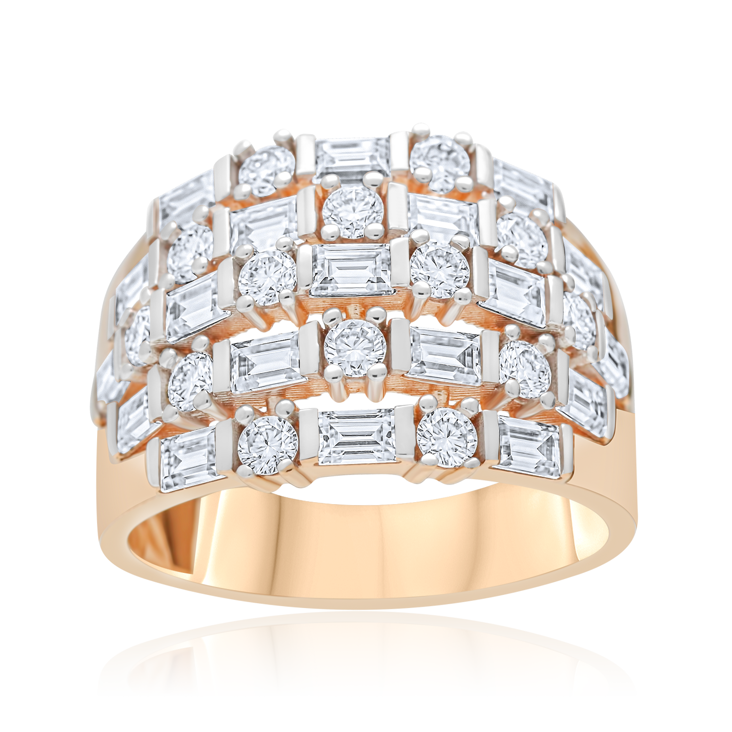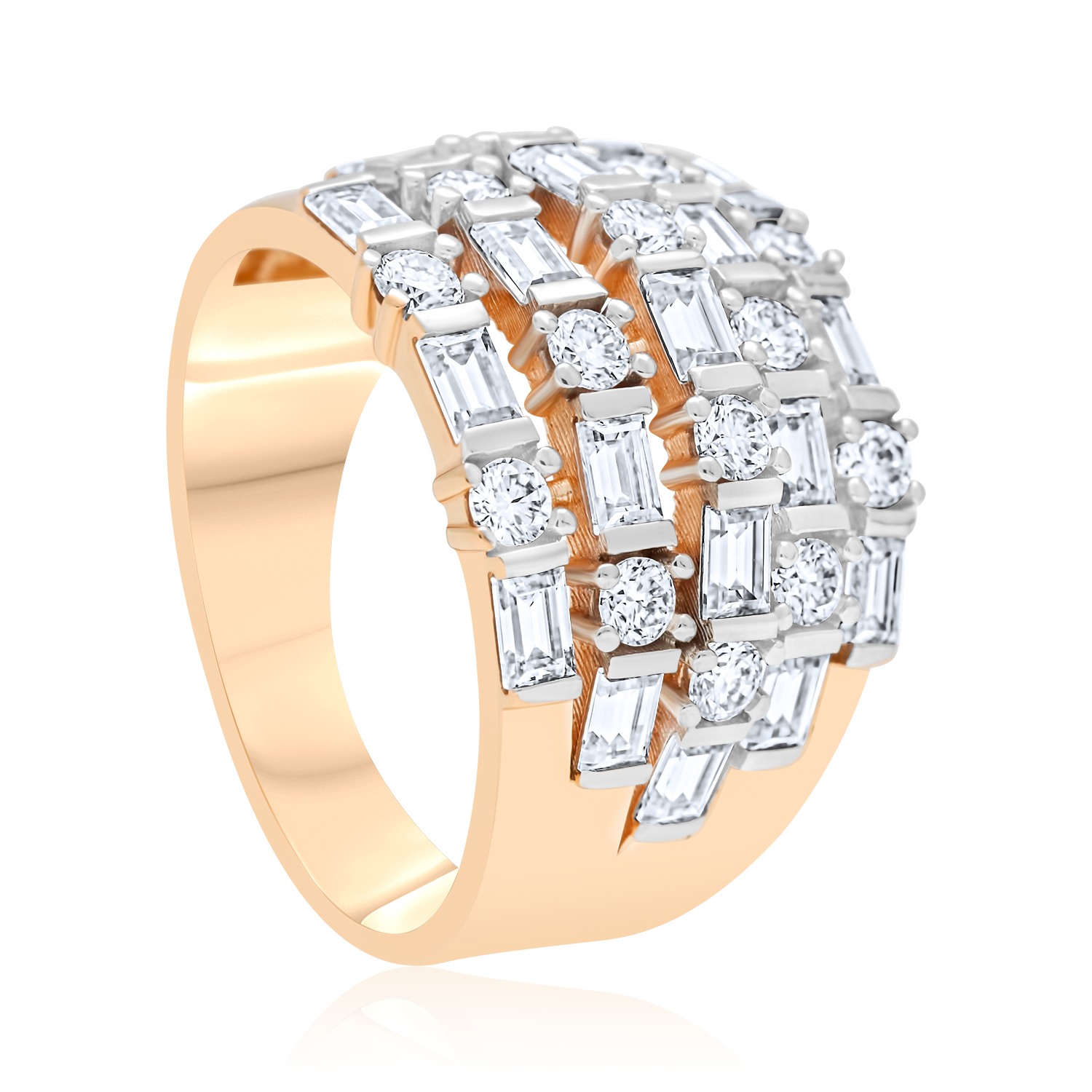 Šis įspūdingas rausvo aukso žiedas traukia akį savo architektūriniu dizainu. Keliomis eilėmis išdėstyti stačiakampiai ir apvalūs moisanitai sukuria dinamišką, prabangų raštą, kuris primena švytintį mozaikos ornamentą. Geometrinių formų derinys suteikia žiedui modernios elegancijos ir išskirtinio charakterio, o tvirta aukso juosta pabrėžia jo solidumą. Tai drąsus ir stilingas pasirinkimas, skirtas moteriai, vertinančiai unikalų dizainą ir išraiškingą prabangą.