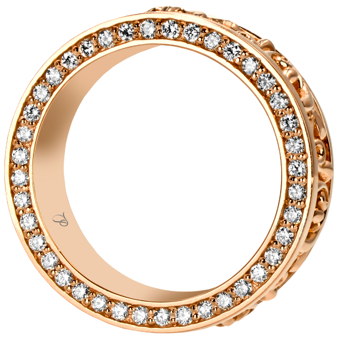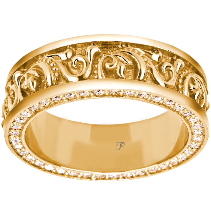 Unikalus auksinis vestuvinis žiedas. Įkvėptas antikinės juvelyrikos stilistikos. Kūrinio konstrukcija yra sudėtinga bei išraiškinga. Žiedo pagrindas yra plokščias ir matinis, o blizgūs reljefiniai raštai ryškiai atsiskiria nuo šio. Ypatingam ryškumui netrukdo net detalių smulkumas, kuris yra vertinamas dar nuo antikos laikų. Negana to, augaliniai žiedo raštai čia yra itin tikslūs - juos sukurti padėjo ne tik talentingos juvelyro rankos, bet ir naujausios technologijos. Galiausiai žiedui nepamirštamos prabangos prideda briliantų eilė, inkrustuota jo viršutinėje briaunoje. Frezuoti augaliniai raštai; Aukštas ir platus žiedas; Atsparus laikui ir pažeidimams; Briliantai inkrustuoti išskirtiniu būdu - šoninėje briaunoje; Dydį rinkitės apie 1/5 didesnį, nei įprastai.