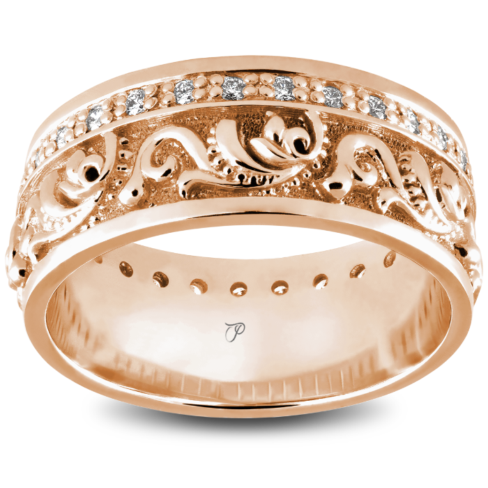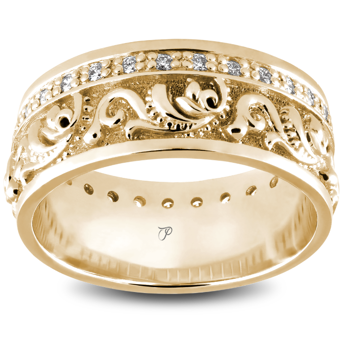 Unikalus auksinis žiedas su briliantais, tinkantis vestuvių ar kitai ypatingai progai. Dizainas yra įkvėptas romantiškosios antikinės juvelyrikos. Žiedas yra įspūdingas labiausiai dėl dviejų skirtingų dizaino krypčių sujungimo - čia preciziški ir išblizgint augaliniai aukso raštai ryškiai atsiskiria nuo grubaus juvelyro rankomis išgauto pagrindo. Ypatingam ryškumui netrukdo net detalių smulkumas, kuris yra vertinamas dar nuo antikos laikų. Detalių tkslumą padėjo išgauti ne tik talentingos juvelyro rankos, bet ir naujausios 3D technologijos. Galiausiai žiedui nepamirštamos prabangos prideda briliantų eilė, sukurta virš augalinių raštų, kur akmenys yra inkrustuoti istorinę juvelyriką primenančiu būdu. Frezuoti augaliniai raštai; Platus, tačiau patogus žiedas; Atsparus laikui ir pažeidimams; Žiedo briauna papuošta nenutrūkstama kokybiškų briliantų eile.