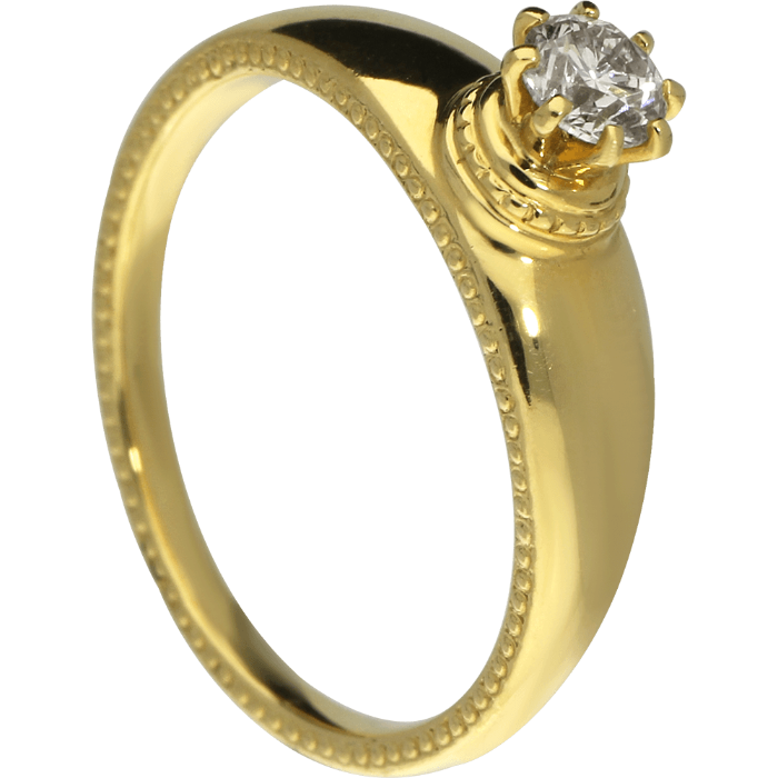 Prabangus ir išskirtinis geltono aukso žiedas su kokybišku briliantu, tinkantis ir sužadėtuvėms ir kitoms ypatingoms progoms. Romantiškas ir kartu elegantiškas žiedas, kurio briaunos dekoruotos juvelyriškais burbuliukais, o išskirtinė 8 kabučių žiedo karūnėlė yra sukurta išskirtiniam efektui.