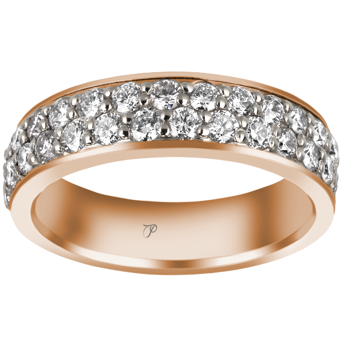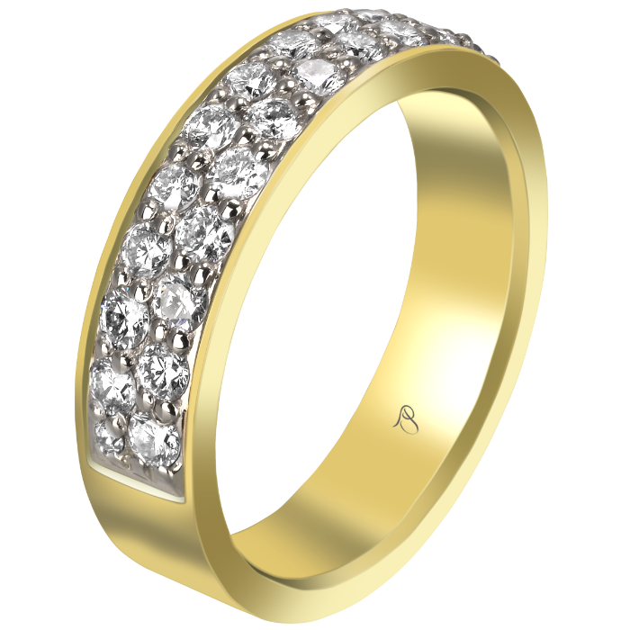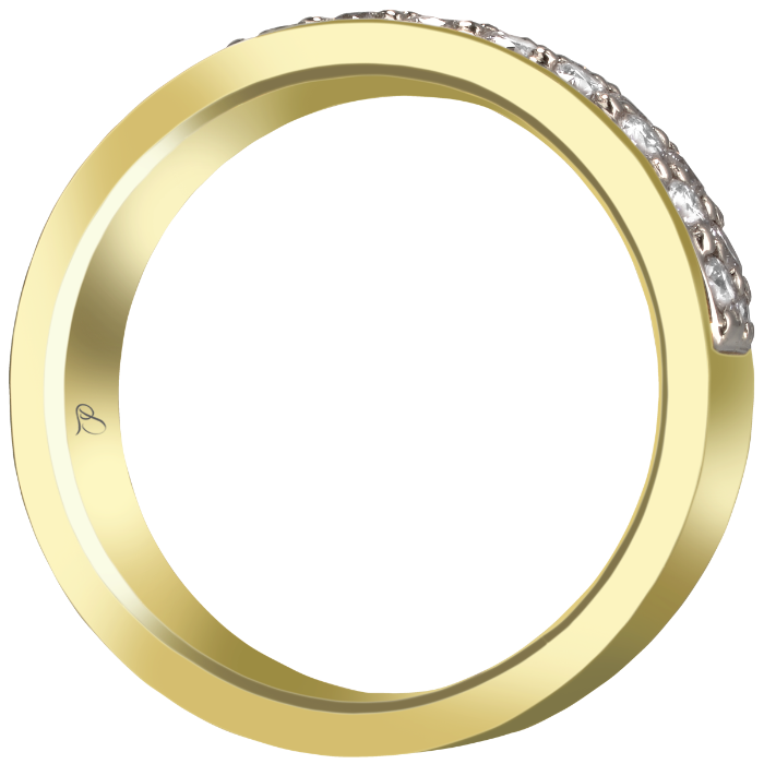 Prabangus auksinis vestuvinis žiedas su briliantais moterims. Gali būti pagamintas iš geltono, rausvo ar balto aukso. Žiedo dizainą įkvėpė modernios klasikos kryptis. Iš pažiūros dirbinio konstrukcija ir briliantai yra klasikiniai. Tačiau kartu jis turi ir šiuolaikinio dizaino detalių: jo vienos aukso spalvos pagrindą puošia baltos spalvos briliantų inkrustavimo dalis. Tai sudėtingas ir išraiškingas sprendimas (išskyrus vien balto aukso variantą). Negana to, žiedo briliantai yra inkrustuoti dvejomis eilėmis, persikeičiančiomis tarpusavyje. Jaunosios, norinčios pridėti prabangos kasdienai, galės nebijoti nešioti žiedą dažnai - kiekvienas briliantas yra simetriškas, be to turi po 5 jį laikančias kabutes bei rėmelį iš šono. Prabangus modernios dizaino krypties žiedas; Ypatingai tarpusavyje persikeičiantys briliantai; Nepralenkiamas tvirtumas; Dvi aukso spalvos; Komfortiškas profilis.