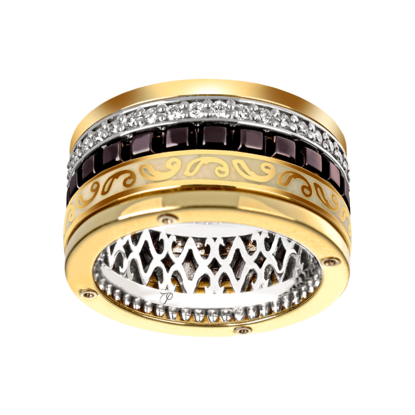 Liukso klasės auksinis žiedas, dekoruotas emaliu, aukštos kokybės rudu rodžiu ir puoštas briliantais. Kiekvienas iš trijų žiedų, sujungtų į vieną, juda atskirai ratu, taip suteikdami kūriniui ne tik magiškos dinamikos, bet ir unikalios prabangos pojūtį. Žiedas apjungia istoriškai reikšmingos juvelyrikos stilių su šiandienine modernios kūrybos kryptimi. Dalis žiedo pasižymi griežtomis geometrinėmis formomis, kurios yra laikomos darnos ir pastovumo simboliu. O romantiškoji jo dalis išsiskiria ypatingai smulkių ir preciziškų formų ekspresija. Tuo tarpu briliantinis žiedas, kurio kiekvienas akmuo įtvirtintas į keturių kabučių karunėlę, prideda žiedui išskirtinės prabangos ir žerėjimo. Balto aukso dalys yra 585 prabos aukso, dengtos baltos ir rudos spalvos rodžiu, o geltono aukso ir emaliu dengtos dalys - 750 prabos aukso. Dirbinys yra išskirtinai prabangaus dizaino ir sudėtingos konstrukcijos, todėl geriausiai tiks nešioti jį ypatingų progų metu. Arba kaip šventinį vestuvinį žiedą, skirtą pakeisti įprastinį, kai atsiranda poreikis pasipuošti.