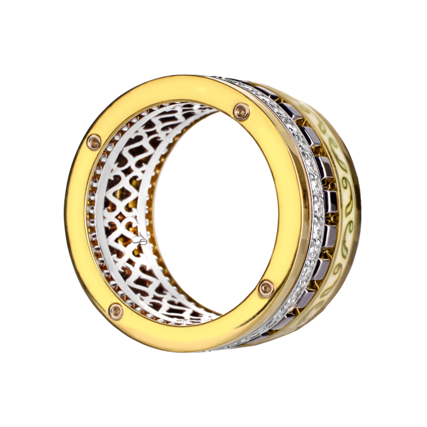 SECRET GARDEN prabangus besisukančių žiedų kūrinys su briliantais ir aukso emaliu