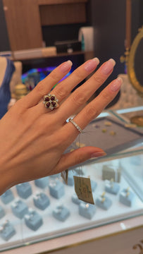 Rankų darbo auksinis dobilo žiedas, puoštas Limožo emaliu ir aukščiausios kokybės natūraliais briliantais.