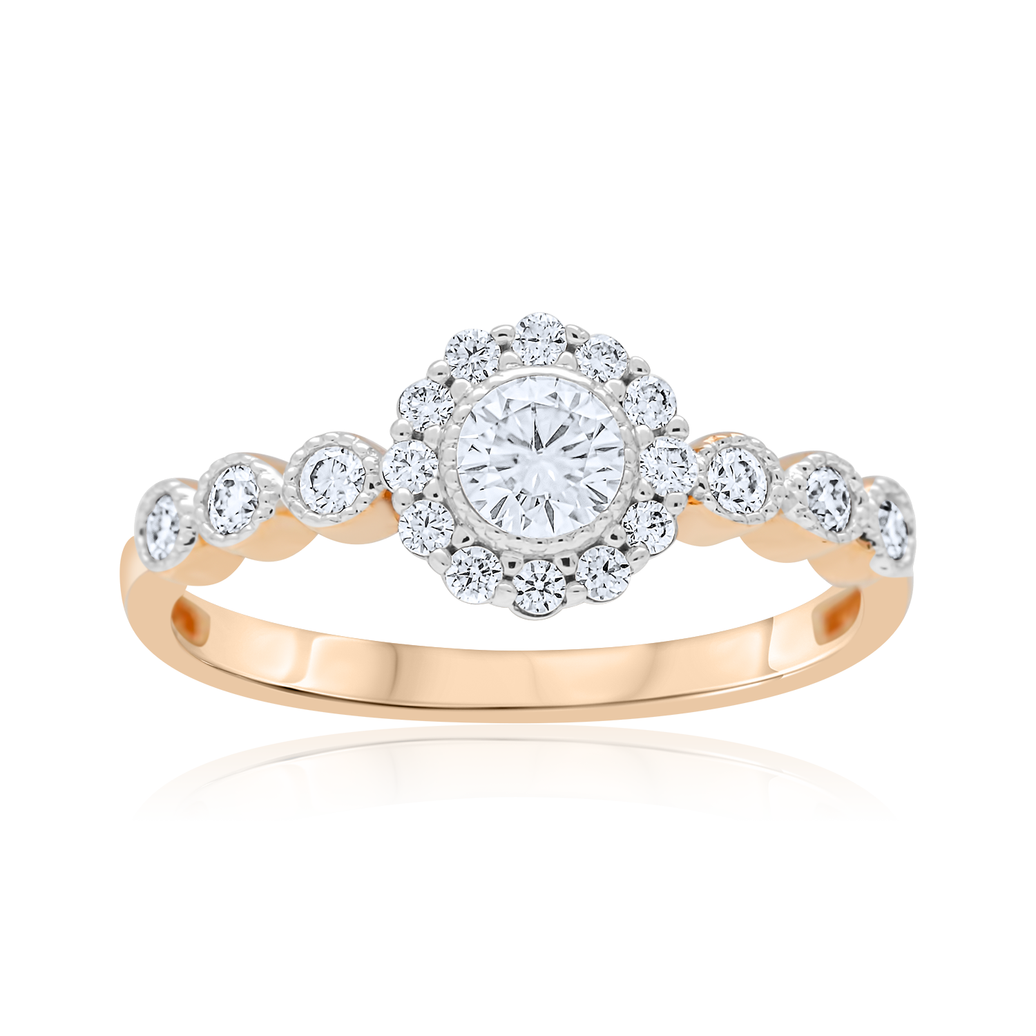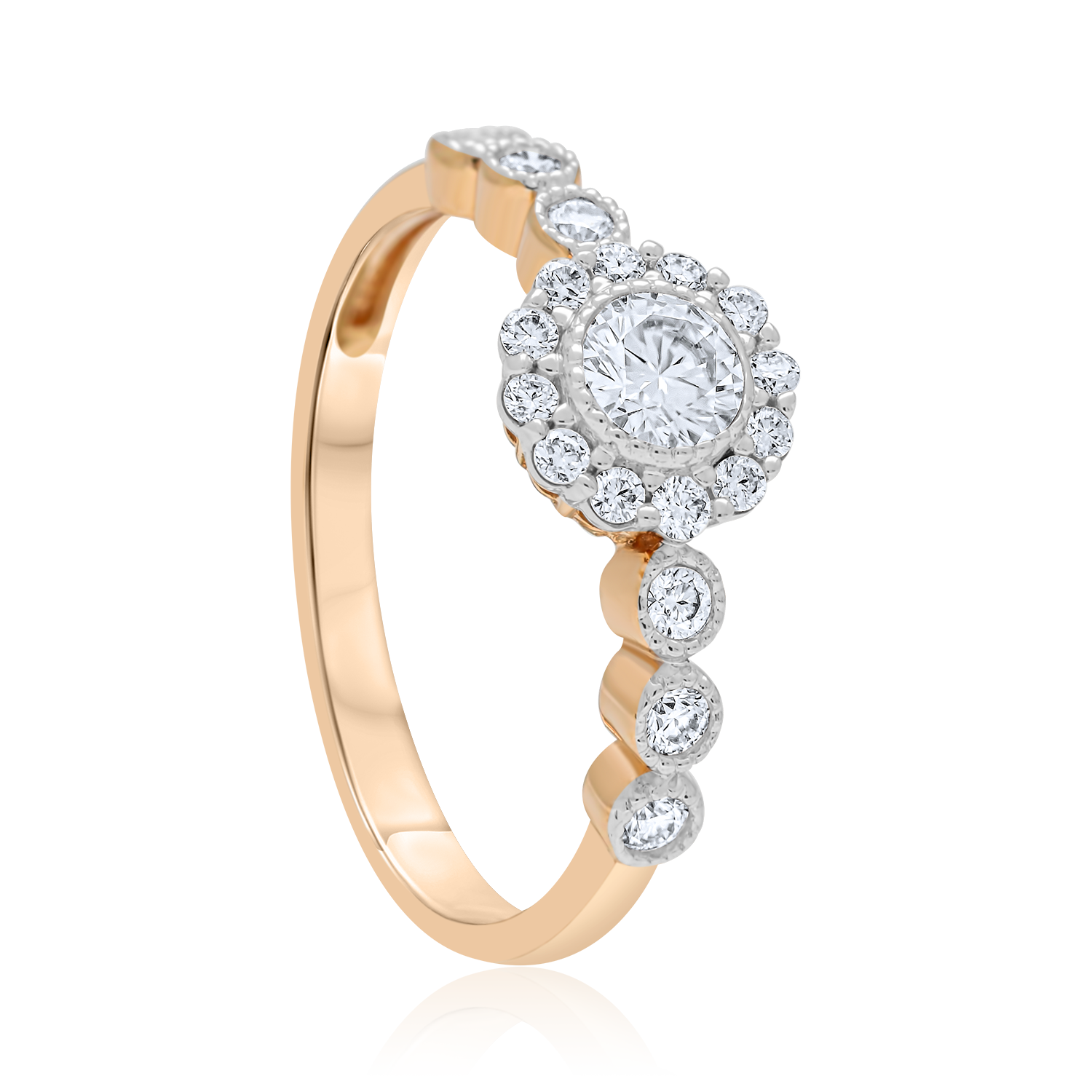 Rausvo aukso sužadėtuvių žiedas išsiskiria rafinuotu dizainu: centrinį moisanitą juosia subtili mažesnių akmenų aureolė, suteikianti žiedui spindesio ir išraiškingumo. Itin elegantišką įvaizdį sustiprina unikali juostos forma – įtaisyti moisanitai tarsi ritmiškai įsilieja į dizainą, suteikdami žiedui lengvumo ir žaismingos prabangos.