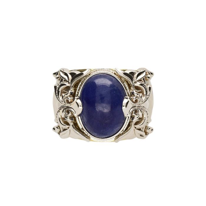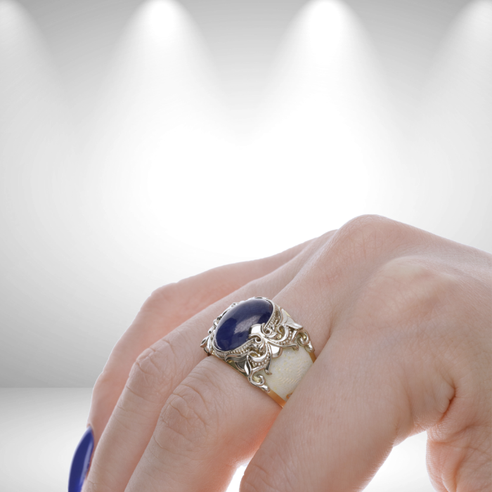 Prabangus, balto bei geltono aukso žiedas, dekoruotas opalinės spalvos Limožo emale ir inkrustuotas net ~ 8,30 ct korundo safyru. Universalus dizainas, tinkantis tiek moteriai, tiek vyrui. Turime galimybę pagaminti tokio paties modelio žiedą ir su kitokiu, jūsų pasirenkamu akmeniu.