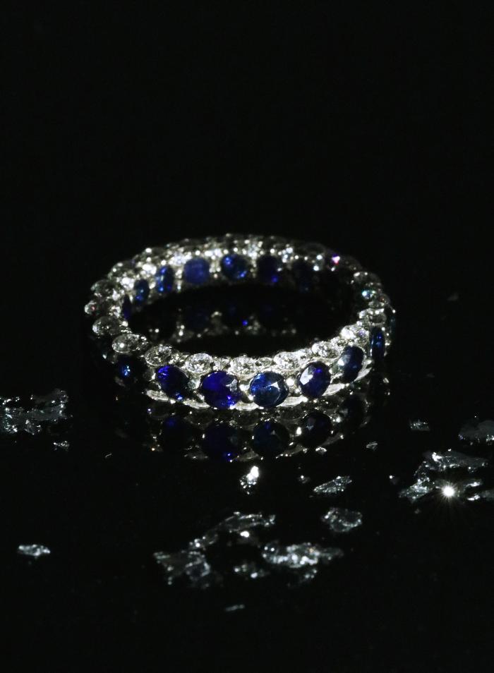- Stone weight, clarity, color: diamonds 120 pcs. ~1.8 ct, RW VS-SI, sapphires 40 pcs. P2.